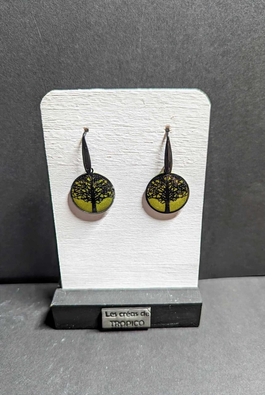 boucles d'oreilles en pâte fimo ou pâte polymère avec une estampe arbre de vie noir posée sur de la polymère vert métallisé et recouverte de résine