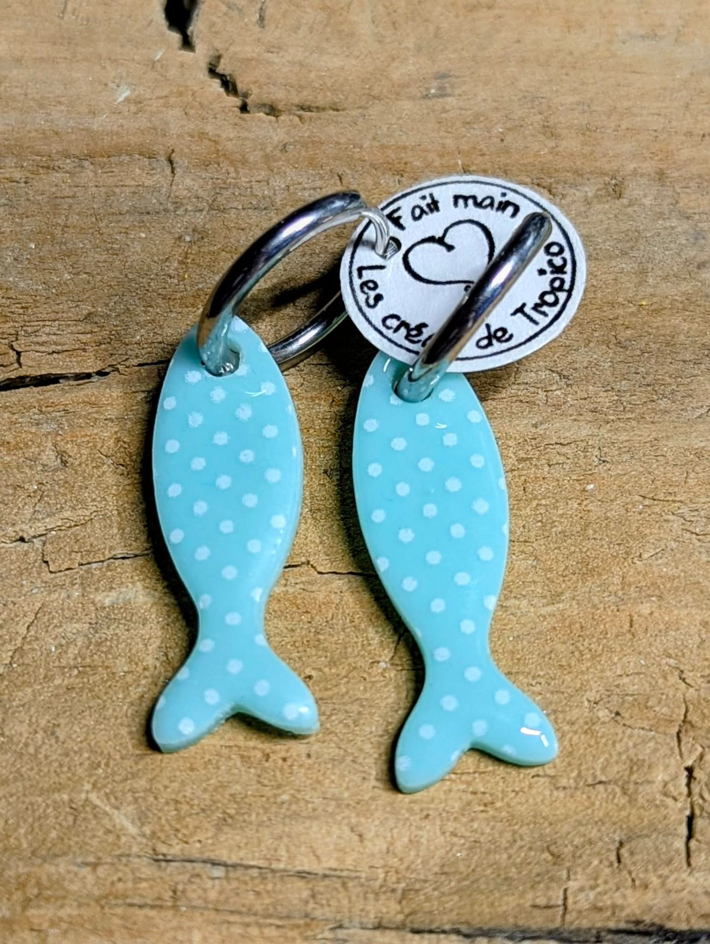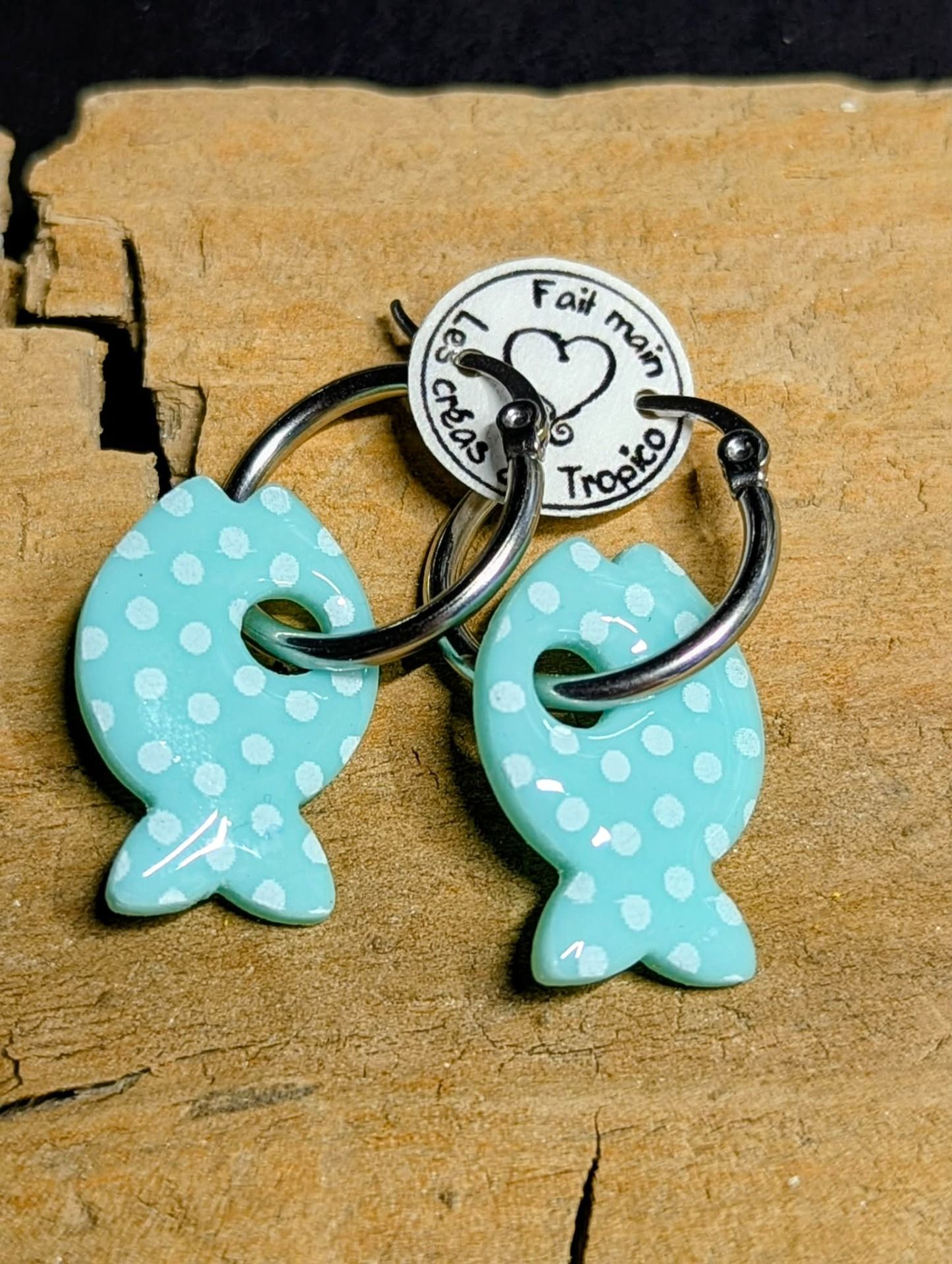 Évadez-vous vers le littoral avec notre collection exclusive de boucles d'oreilles poissons. Façonnées avec passion en argile polymère, ces créations arborent une teinte vert menthe rafraîchissante, parsemée de pois blancs délicats pour un look à la fois rétro et ludique.