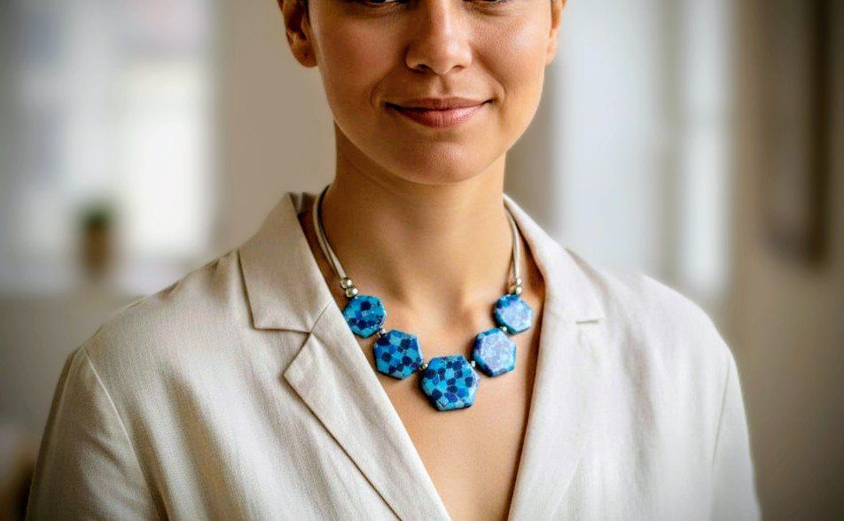 Affirmez votre style avec ce collier "Mosaïque Hexagonale". Chaque perle géométrique est façonnée à la main en argile polymère, présentant un jeu de textures et de teintes bleues (nuit, turquoise, ciel) rehaussé par de fines particules argentées qui capturent la lumière. La disposition en dégradé de taille des hexagones structure le buste avec élégance.