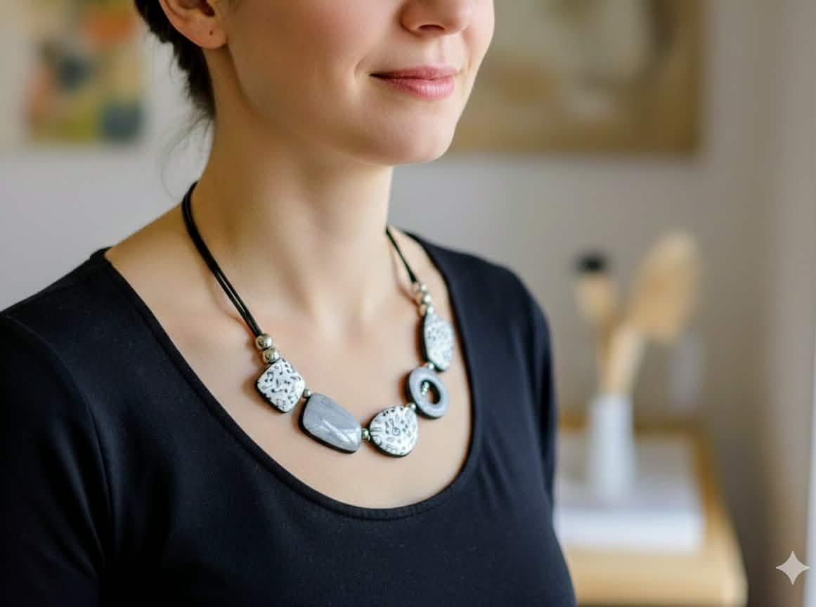 Grâce à sa palette de couleurs neutres (gris, blanc et noir), ce collier est un caméléon de la mode. Il sublimera un chemisier blanc classique pour une allure chic au bureau, ou apportera une touche artistique à une petite robe noire en soirée. Sa longueur mi-longue met en valeur le décolleté tout en restant sobre et sophistiquée.