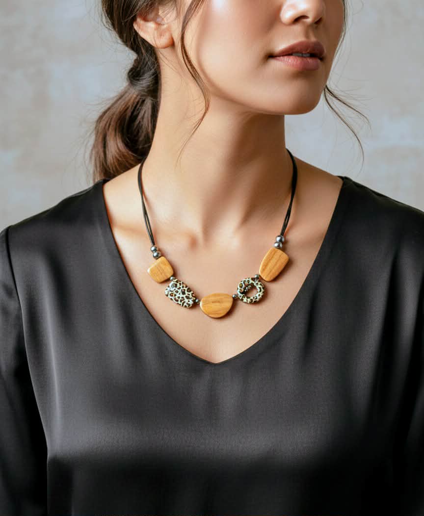 Oubliez la production de masse ! Ce collier est une véritable œuvre d'art, façonnée à la main avec amour et savoir-faire. Les variations du bois et de l'imprimé font de chaque collier un trésor unique.