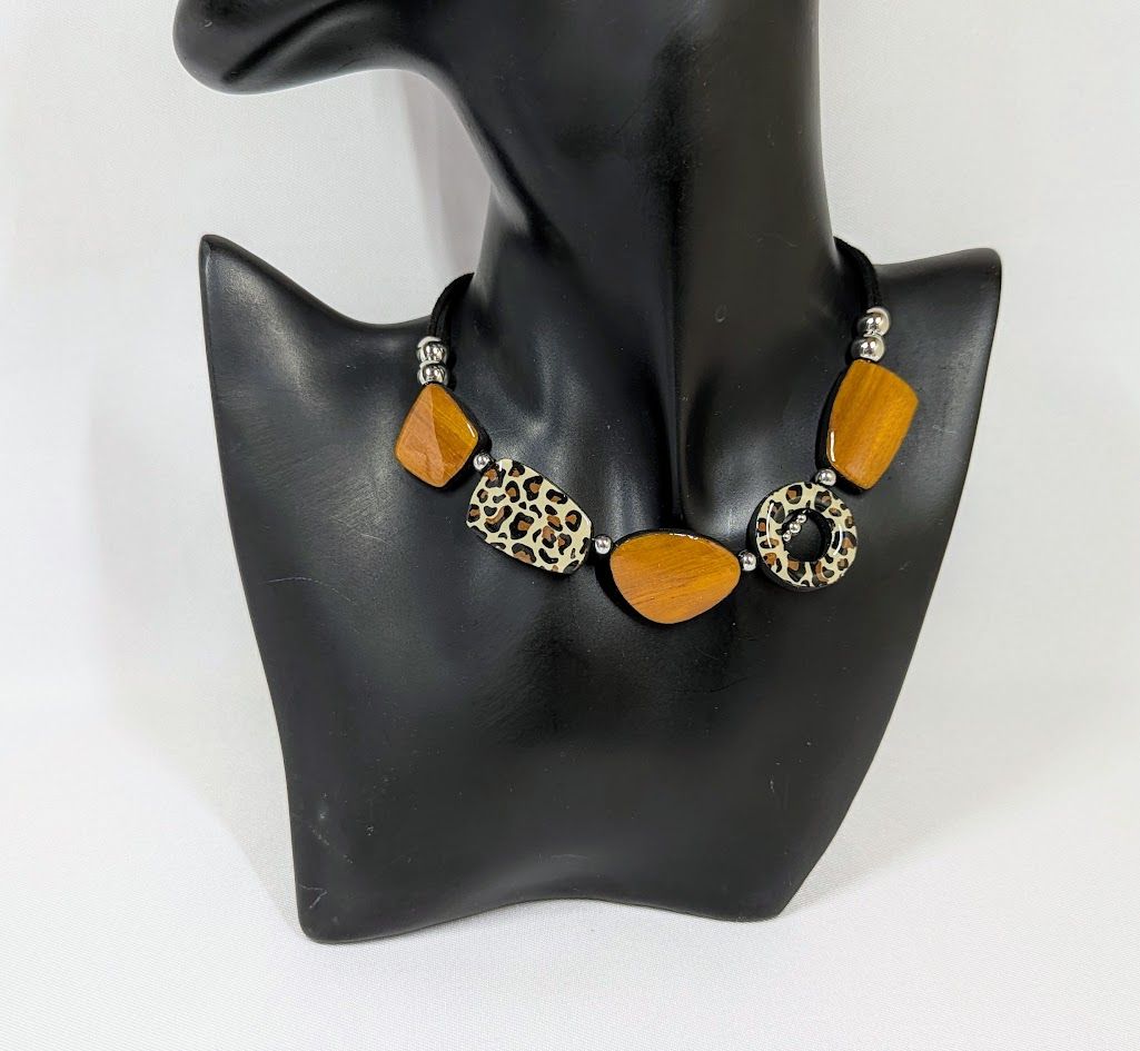 Affirmez votre style avec ce collier artisanal unique, combinant l'élégance du bois clair verni et l'audace de l'imprimé léopard. Fabriqué à la main avec des matériaux de qualité, il apportera une touche sauvage et sophistiquée à votre tenue.